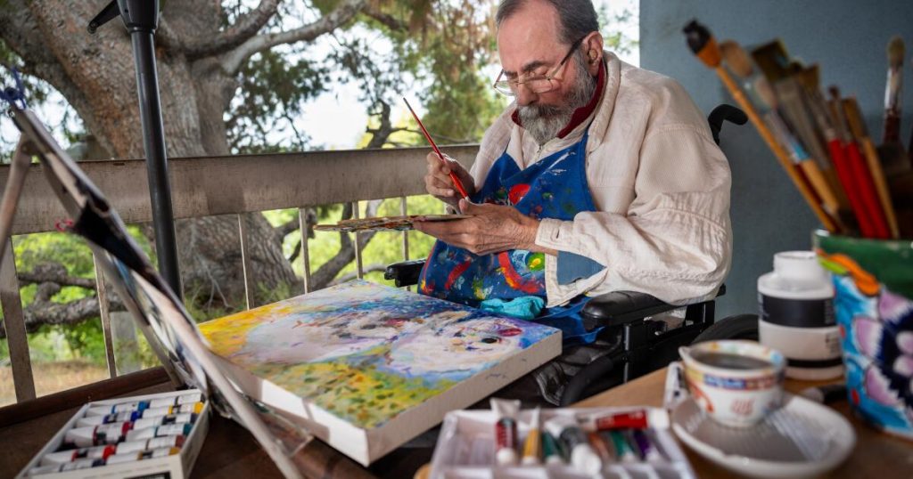 Seated on his sister’s patio in El Sereno, the 85-year-old artist only wants to focus on his latest painting in front of him — even as the bird sings to him.