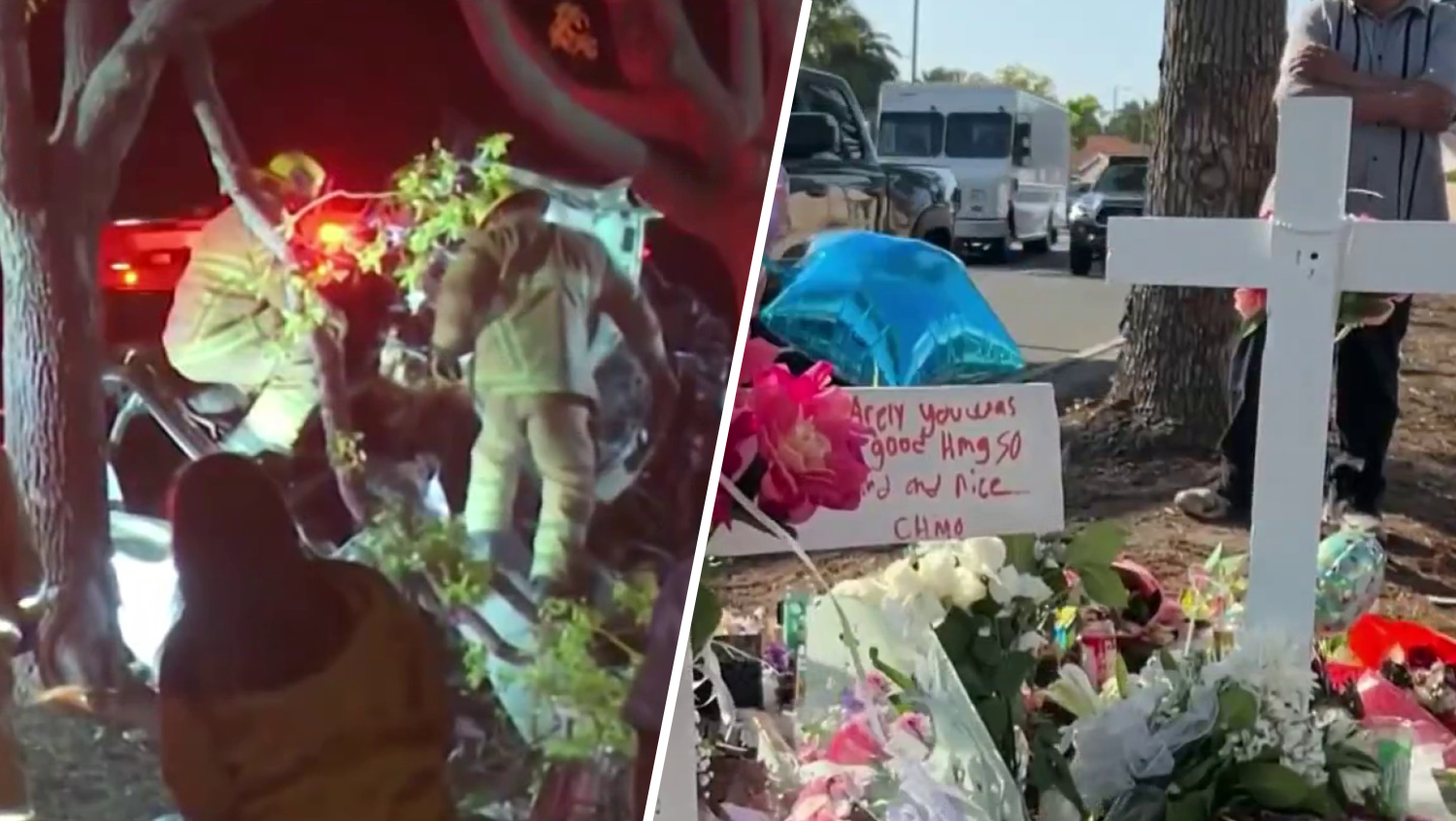 Flowers and crosses mark where the driver slams onto the Santa Ana tree. The family and community continue to lament five individuals, including a pair of sisters.