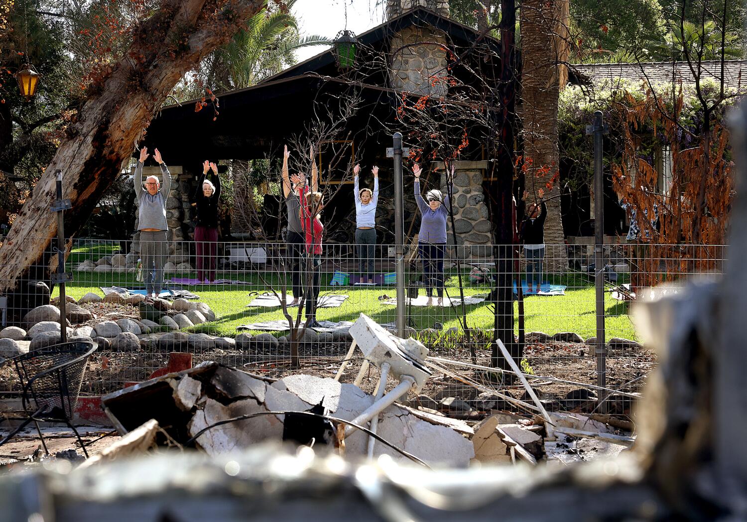 Twelve participants, including an 82-year-old woman who lost her home in the fire, stretched out the mats on the green grass under the sung eucalyptus tree. The bird squealed. Down the street, the chain gets caught up in hiking.