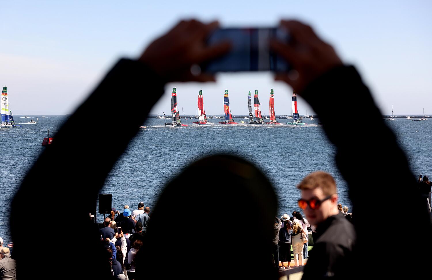 The race is reflected from San Diego’s Chris Bartolomeo glasses while watching the Rolex Los Angeles Sail Grand Prix during the race day.
