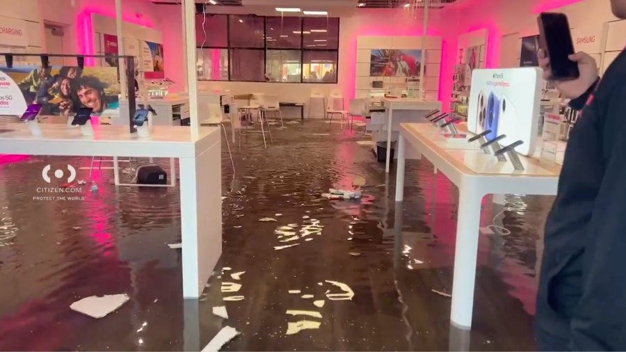 A video from Citizen.com showed water, wires and panels falling from the ceiling. A few inches of water filled the floor of the T-Mobile building and flowed under the table holding the phone and technology display.