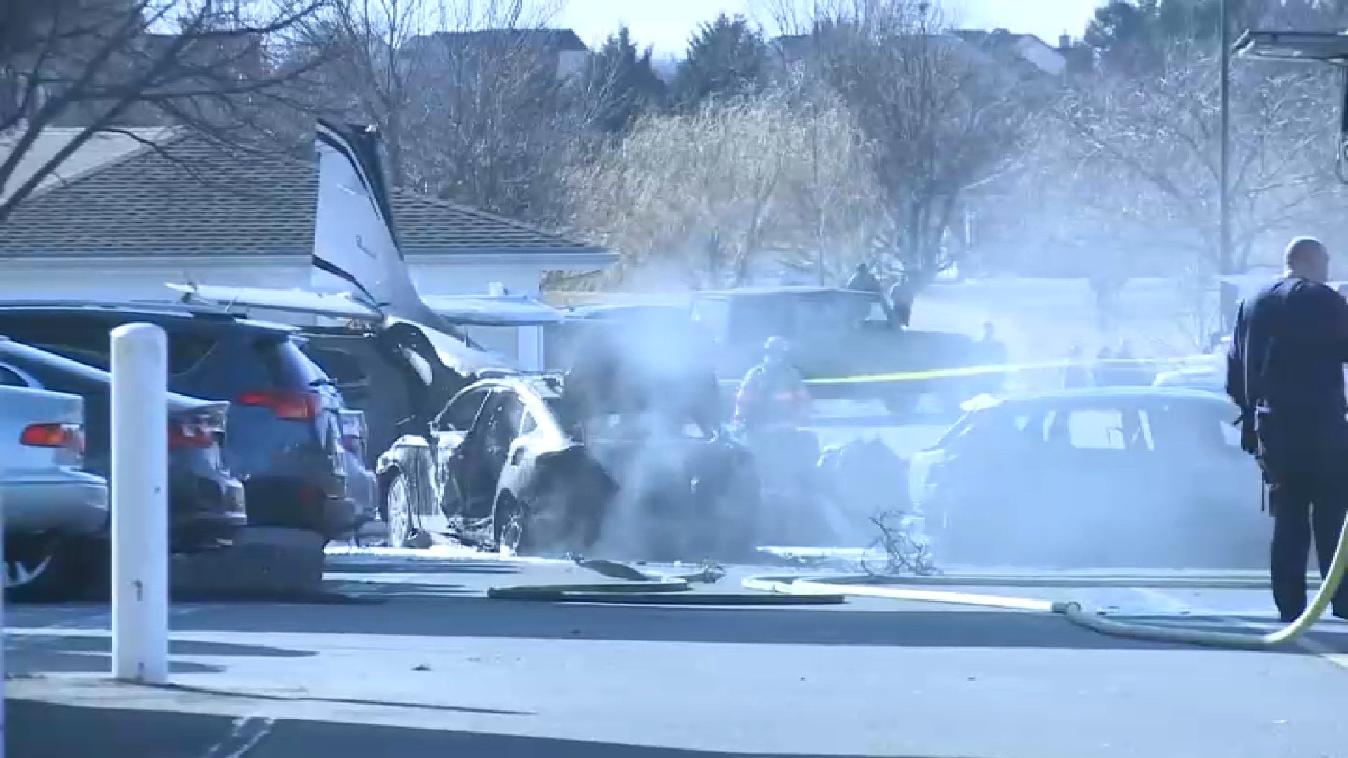 WGAL footage shows firefighters, police and other first responders who gathered in the parking lot and heavy smoke, what appears to be part of at least two badly damaged, burned-out cars and small planes.